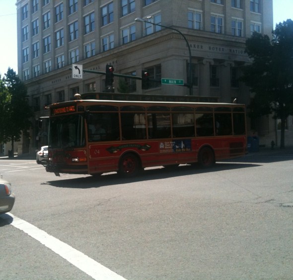 Another trolley passing by the historic Baker Boyer Bank building.