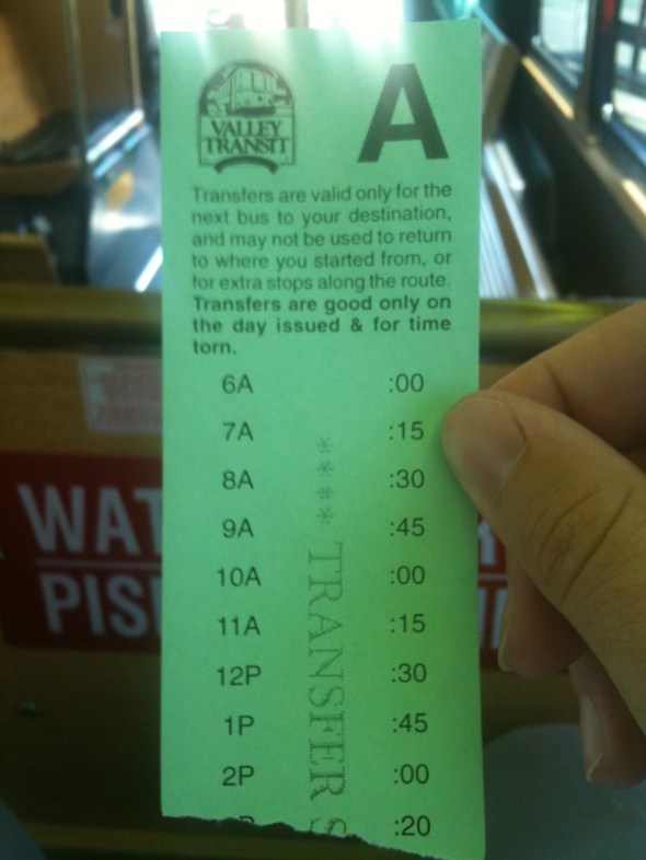 I’ve been on Valley Transit several times before, but I’ve never actually tried using a transfer slip on their buses, so it was a bit of a learning curve. We got these transfer when we boarding Route 3 at WWTC, disembarked at the corner of S 2nd Ave and W Tietan St, and then walked west on Tietan and boarded Route 5 at the corner of Milburn Dr and S 3rd Ave. We had to flag down the bus on Route 5 since there were no bus stops that we could see and the bus was literally right there. (I later saw that there was a stop a block up 3rd Ave.) When we boarded the bus, the bus operator bluntly told us that we weren’t allowed to use transfers in this circumstance, but he was going to let it slide this time. On the Valley Transit website, the listed policy for transfers is this: “If one bus cannot get you to your destination, a free transfer will be issued upon boarding the first bus to get you to another bus. Transfers are free and valid within the hour. Transfers may be used anywhere routes intersect, but cannot be used for a return trip.” Since we were on a “return trip” towards WWTC, the bus operator was correct in what he told us. My only complaint is that the policy wording is pretty vague, and leaves room for abuse of the rules. Also, though I wouldn’t necessarily call myself an out of towner, but I do think tourists might be thrown off a bit by this policy. The good thing though is that a Valley Transit fare is only $0.75, so it’s not a huge deal in the long run.