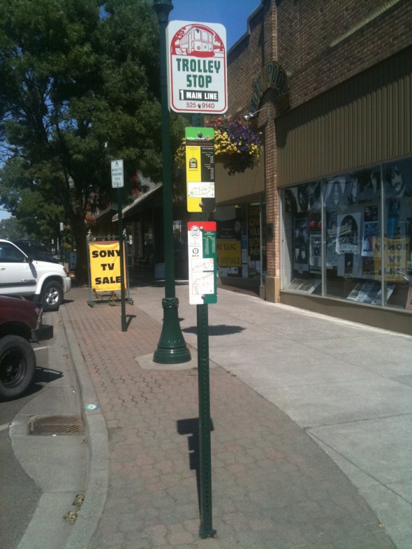 The thing I like about Valley Transit is that along with the stop flag, a good number of their heavy-use stops include the schedule and route information. For this particular stop, information for Route 1, which serves the stop during regular Monday to Friday service, and the East Loop Route for Evening/Saturday service is included.