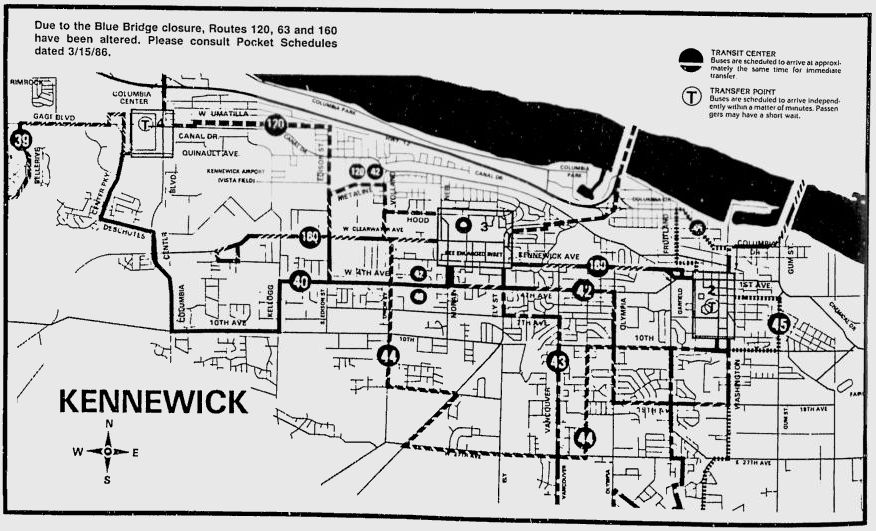 Kennewick – Right off the bat, Routes 40, 43, 44, and 45 all are long gone routes. If you look closely, you’ll notice several differences in the layout of the road system as compared to the modern layout. Also interesting to note is that Huntington Transit Center (or any of Ben Franklin Transit’s transit centers) hadn’t been opened at this time. In Kennewick, the main transit point was located on Morain Street in front of the old WareMart (now occupied by Walker’s Furniture). I have seen a map that indicates the transit center may have also been at a point on Morain Street north of Clearwater Avenue, but I haven’t seen any information that supports that as of this time. In east Kennewick, the transfer point was located at the corner of 6th and Auburn, in front of the building that was occupied by Benton PUD at that time. (The building later was occupied by the Kennewick School District, now unoccupied.) The only remnant of this is a stop shelter just west of the intersection on 6th Avenue. In west Kennewick, the transfer point was located in the parking lot at Columbia Center Mall, which is where it remained for a very long time until the opening of Three Rivers Transit Center.
