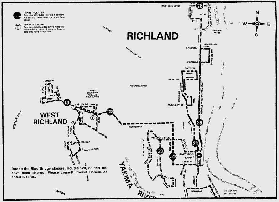 Richland/West Richland – Apart from a few changes, Richland and West Richland have seen very few changes since the early years of BFT operations. In particular, Route 23 today is nearly the exact same as it was in 1986, minus the extension to Battelle Center. Also easy to notice is Route 10, which was deleted sometime during the 1990’s, but was reinstated in a different form in the mid 2000’s, and now runs at Route 110 between West Richland TC and Three Rivers TC via Bombing Range Road, the Queensgate area, and Columbia Park Trail.