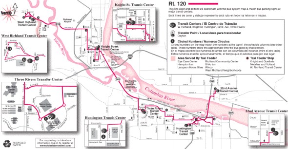 - West Richland TC to Knight Street TC – introduce new Route 22, operating as a Richland local route. It will retain the routing that the 120 currently uses between the two transit centers, though service levels will be dropped down to “peak-emphasis.” Between 6-9AM will be a 30 minute headway, 9AM-2PM will be a 60 minute headway, and 2-6PM will be a 30 minute headway.