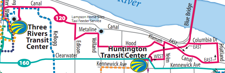 On Canal Street, the bus has a whooping 4 bus stops in either direction (except for one at Canal/Fruitland on 120EB, all are west of Edison Street). On Edison Street, there’s only 1 bus stop eastbound, and 2 westbound. With the exception of Columbia Drive (classified as a principal arterial), the route spends it’s entire time between Three Rivers TC and Huntington TC on Collector Streets (Volland, Fruitland) and Local Streets. This should make any transit planner cringe. Route 120 is supposed to be a “focus route,” but it’s routing makes it anything but that. The only time it’s truly an intercity route is when it crosses the Blue Bridge between Kennewick and Pasco, and when it travels between Knight Street TC and Three Rivers TC.