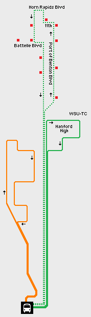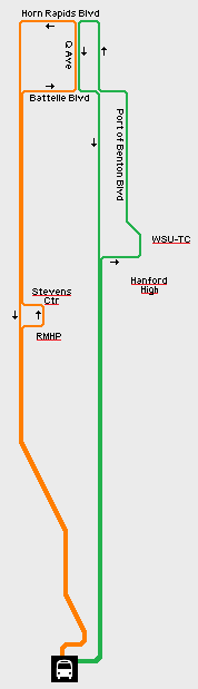 During peak hours, the bus turns left at Wazzu Pl (the street at the western edge of the parking lot), then travels north through the campus property by way of the very windy Crimson Way, where it passes by the Consolidated Information Center (WSU Library and PNNL-managed Hanford Technical Library). At the intersection with 1st St, the bus continues north along Port of Benton Blvd, passing by the offices of multiple Hanford-related companies. At 11th St, the bus turns left and then re-intersects with George Washington Way. After turning right and heading north for a short distance, the bus turns left and heads west on Horn Rapids Rd. At Q Ave, the bus turns left and heads south, passing through the middle of the Battelle/PNNL campus. At Battelle Blvd, the bus turns right, serves a stop directly in front of the PNNL building (at the north end of Einstein/W Ave), then heads south on Einstein/W Ave. When intersecting with 5th Ave, the bus turns left and then left again at Q Ave. The bus then continues north along Q Ave, passing through the Battelle/PNNL campus again. At Horn Rapids Rd, the bus turns right and then right again at George Washington Way. At the intersection with Sprout Rd, the bus turns left to head towards the WSU Tri-Cities campus. However, this time the bus continues on to Harris Ave and follows the same route that is always followed by Route 26 during off-peak hours.