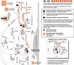 Route 23: As you can tell by the presence of the old BFT logo, Route 23 has remained unchanged for a long time. (Based on the verified info I have, it’s looked like this since at least January 1998, and probably even longer.) From Knight Street TC, the bus heads north on Goethals Dr, then east on Swift Blvd. Once on Swift Blvd, the bus serves the Richland Public Library. At Jadwin Ave, the bus turns left and heads north, passing by the Uptown Shopping Center and Chief Joseph Middle School, along with multiple apartment complexes. At the intersection with Highway 240, Jadwin Ave ends and the bus turns right to continue north along Stevens Dr (which is designed as a limited-access urban highway on this segment to help move Hanford traffic). At Stevens Center Place, the bus turns off and serves the office buildings there, which includes some Bechtel National offices. Once passed through the Stevens Center complex, the bus turns left off Garlick Blvd to head east on Spengler Rd, where immediately there is a bus stop to serve the Richland Mobile Home Park. The bus continues down Spengler Rd, until it turns right onto Carriage Ave, which is the last street before Spengler Rd intersects with George Washington Way (which is driven on by Route 26). On Carriage Ave, the bus heads south to Saint St. On Saint St, the bus then heads west, turning off at Newcomer Ave, which is the last street before Saint St intersects with Stevens Dr (which Route 23 had previously gone north on). On Newcomer Ave, the bus continues heading south. Several blocks after turning on Newcomer Ave, the road curves and becomes an east-west street, renamed Newcomer St. On Newcomer St, the bus takes the very first right at Pike Ave. The bus travels south on Pike Ave for a short time before intersecting with McMurray St. On McMurray St, the bus heads west for a short distance before turning left at the intersection with Jadwin Ave. Finally, the bus travels south on Jadwin Ave along the same path traveled when headed north, turning west at Swift Blvd and south on Goethals Drive to end the trip at Knight Street TC, where it then switches to Route 26.