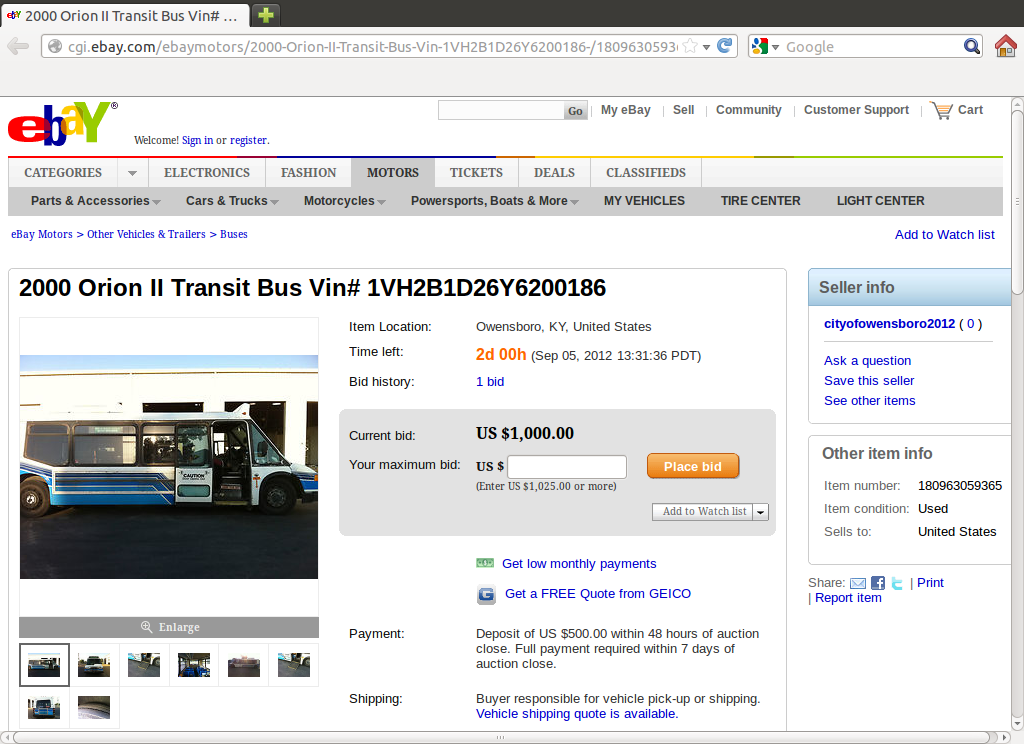 Posted: September 7, 2012 Filed under: Transit Leave a commentEvery now and then, I like to go on Ebay.com and take a look at the different buses being auctioned. Sometimes I might find a subtle difference on one bus compared to another, sometimes I find some pretty old buses, and sometimes I find buses that are just plain weird. Weird is probably the best word to describe one of the buses I found for sale: An Orion II.