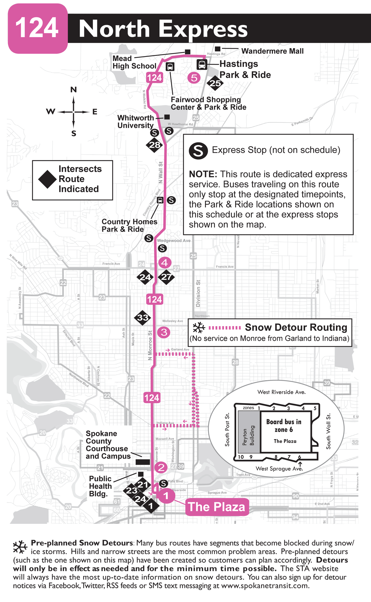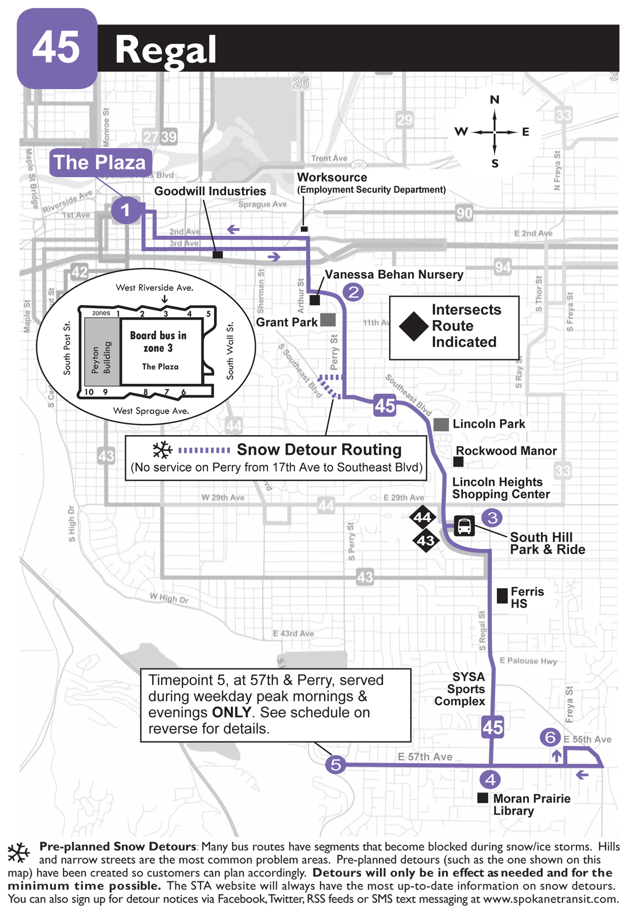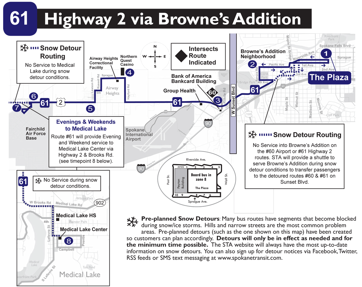 Pre-planned Snow Detours: Many bus route have sements that become blocked during snow-ice storms. Hills and narrow streets are the most common problem areas. Pre-planned detours (such as the one shown on this map) have been created so customers can plan accordingly. Detours will only be in effect as needed and for the minimum time possible. The STA wesbsite will always have the most up-to-date information on snow detours. You can also sign up for detour notices via Facebook, Twitter, RSS feeds, or SMS text messaging at www.spokanetransit.com.