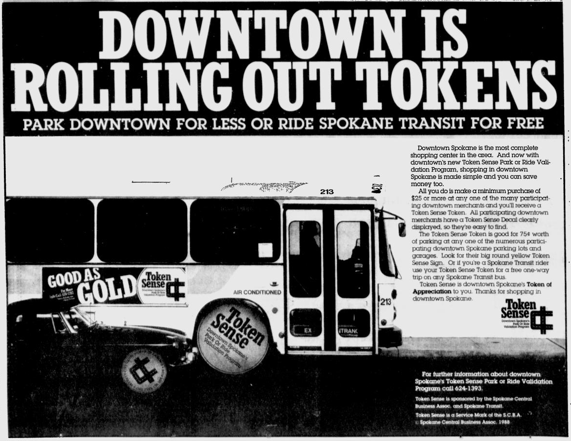 Part of an effort to help market the central business district, Token Sense was launched as a collaboration between the Spokane Central Business Association (later renamed the Downtown Spokane Association) and Spokane Transit Authority. By making a minimum purchase of $25 or more at participating retailers, shoppers would receive a gold Token Sense token, which was then redeemable for 75¢ of parking at participating lots/garages, or for a one-way trip on any Spokane Transit Authority bus.